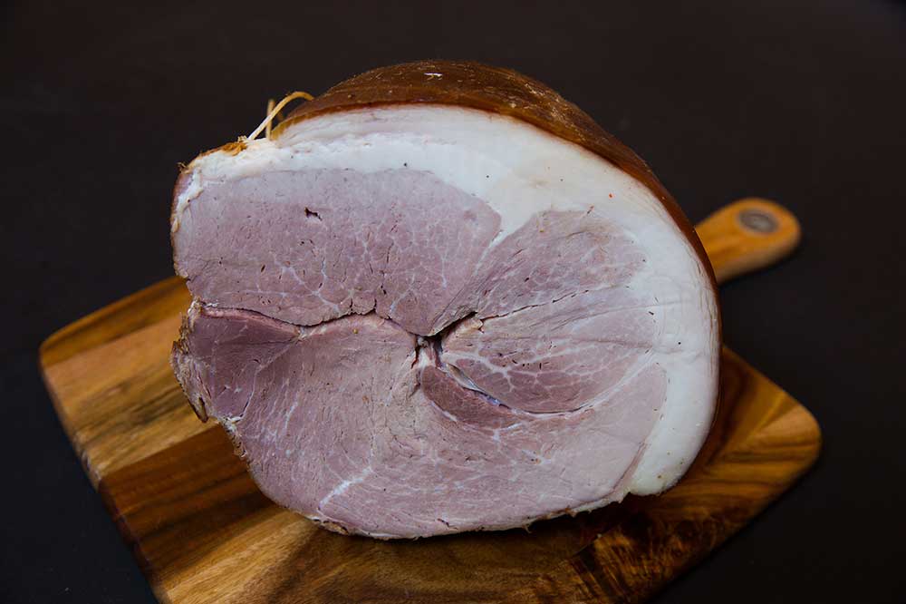 • A fully boned leg which is hand trimmed and tied with the skin left over, then smoked over german beech. 2 to 3kg. This ham is sold by weight at $38.90 per kilo so you get what you pay for, nothing less, nothing more.